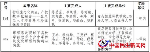 近日,山東省教育廳公布了第九屆教學(xué)成果獎(jiǎng)(高等教育類)獲獎(jiǎng)名單,青島恒星科技學(xué)院兩項(xiàng)成果獲得省級(jí)高等教育教學(xué)成果獎(jiǎng)。其中,由董事長(zhǎng)陳昌金教授主持的《行校生態(tài)化共生,產(chǎn)教數(shù)字化融合——應(yīng)用型人才培養(yǎng)基本路徑探索與實(shí)踐》獲得山東省教學(xué)成果獎(jiǎng)一等獎(jiǎng);王冰教授主持的《課程思政視域下高校學(xué)前教育專業(yè)中華傳統(tǒng)文化課程的構(gòu)建與實(shí)施》獲得山東省教學(xué)成果獎(jiǎng)二等獎(jiǎng),是學(xué)校教學(xué)成果獎(jiǎng)質(zhì)量的一次重大提升。