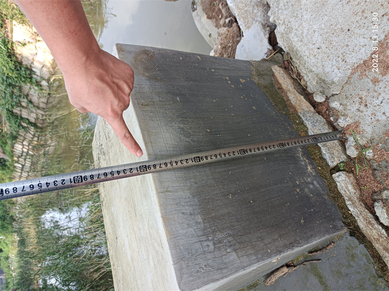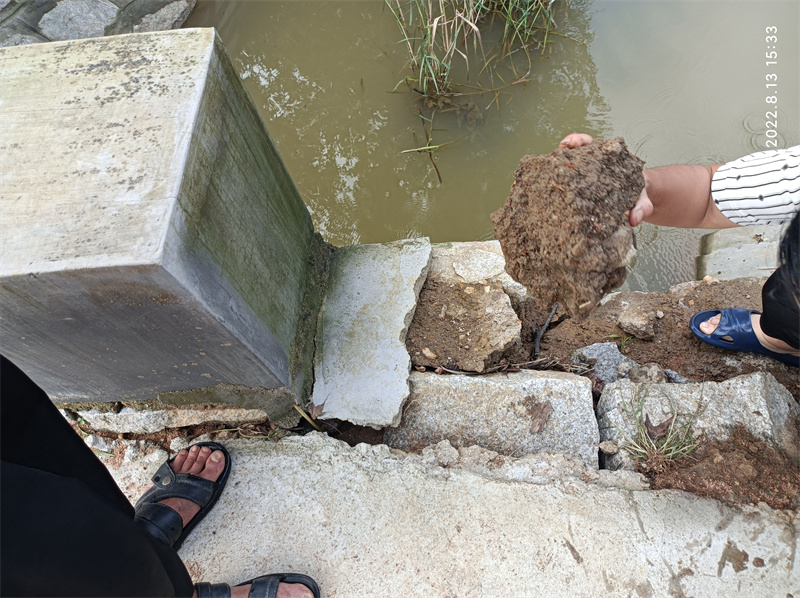 調(diào)查員在事發(fā)現(xiàn)場注意到,該橋梁兩側(cè)并沒有設(shè)計單位及施工單位標識,橋梁高度明顯低于兩岸,橋梁設(shè)計的泄洪口由兩根預(yù)制水泥管代替,非常容易堵塞。橋面一側(cè)設(shè)計有防護墩,而另一側(cè)卻不知去向。調(diào)查員仔細觀察發(fā)現(xiàn),防護墩設(shè)立非常脆弱,鏈接防護墩的水泥標號明顯不符合標準,呈“豆腐渣”狀。