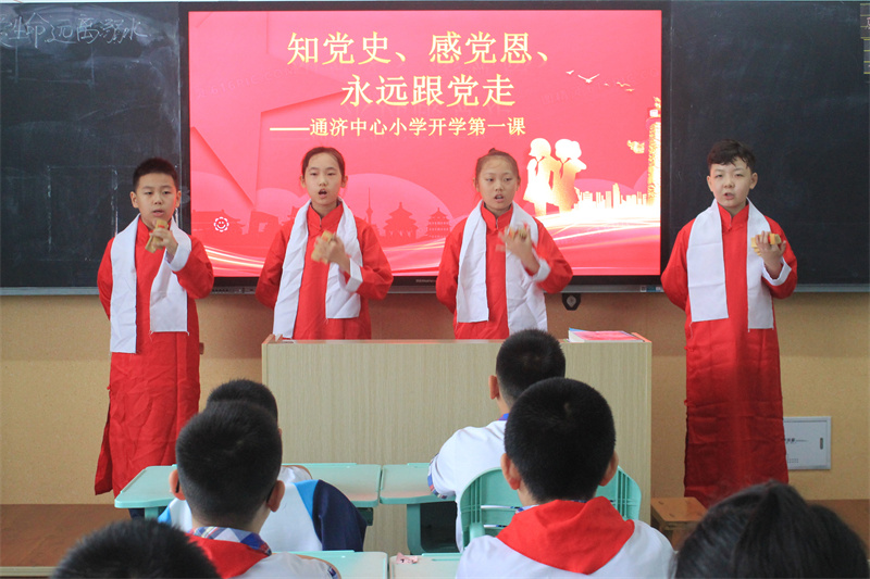 “我們都是中國娃,從小長在紅旗下,我們都是中國娃,學(xué)黨史,聽黨話!”走進通濟中心小學(xué)五年級二班的教室,傳來一陣清脆的快板聲。王熙昊、李澤晨等四位同學(xué)正在為大家表演快板《永遠跟黨走》,朗朗上口的說詞,聲情并茂的表演,臺下的同學(xué)們也跟著節(jié)奏拍起了手,整個教室的氣氛歡快而熱烈。
