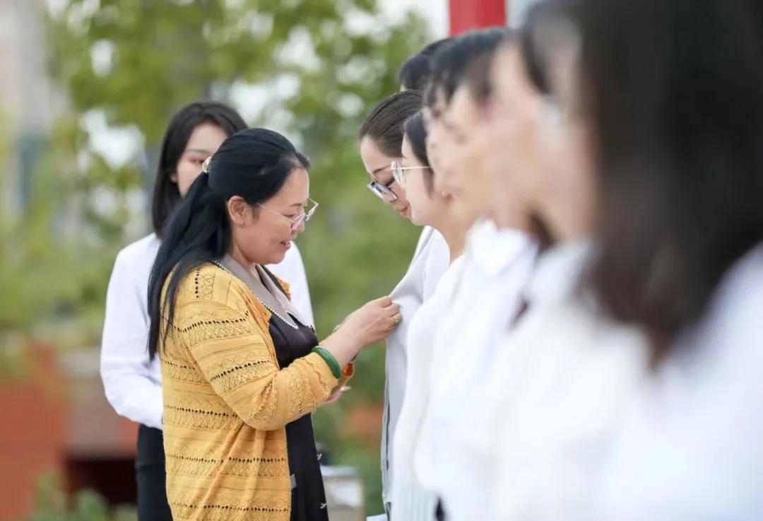 隨后,校黨委副書記、執(zhí)行校長徐愛民,組織部部長黃巖及青島第五屆高校教學(xué)名師獲得者莊新穎、單菁華為新進(jìn)教師佩戴?;?。