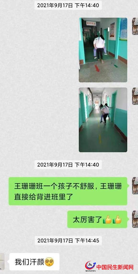 去年,王姍姍老師班級(jí)內(nèi)一位同學(xué)突然肚子痛,王老師迅速背起學(xué)生,小小的身軀蘊(yùn)含著大大的力量。