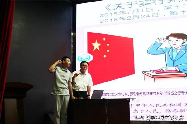憑著多年從教經驗和法律實踐經驗,朱律師很快的把同學們帶入了法律的海洋中。朱律師首先從國家憲法日、就職宣誓、憲法的法律效力、憲法史等方面帶領大家初步認識憲法,一個小的互動環(huán)節(jié)——模擬就職儀式公開憲法宣誓,將會場氣氛掀起了一個小高潮。