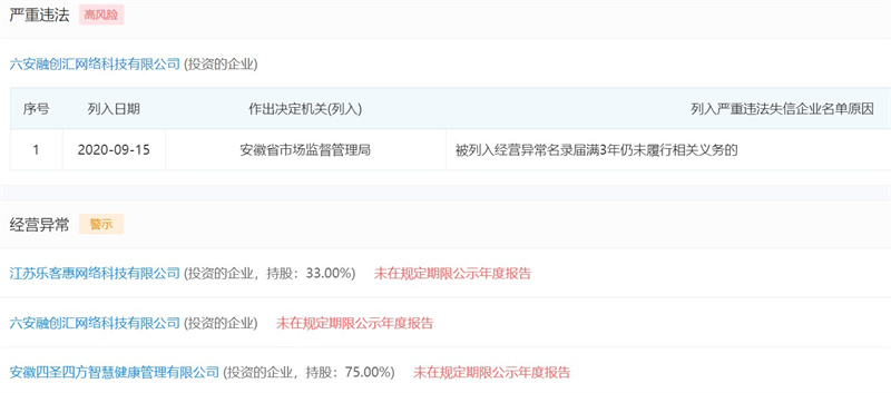 鄧賢炳名下的其他企業(yè)也是問題重重,多家企業(yè)因未在規(guī)定期限公示年度報告而被當?shù)乇O(jiān)管部門列入經(jīng)營異常名錄,值得一提的是,由他投資的六安融創(chuàng)匯網(wǎng)絡(luò)科技有限公司更是早已被安徽省市場監(jiān)督管理局列入嚴重違法企業(yè)名錄之內(nèi)。據(jù)統(tǒng)計,目前由他擔任法定代表人的企業(yè)共有4家,其中3家已經(jīng)注銷;由他投資的企業(yè)共有7家,其中有3家已然注銷,還有兩家已處于吊銷的經(jīng)營狀態(tài)。