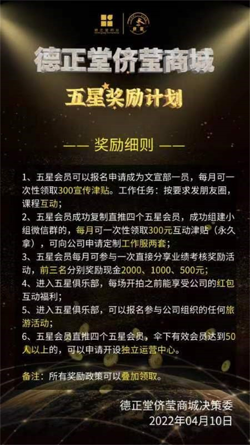 2022年4月10日,為了進一步刺激市場,“德正堂儕瑩商城決策委”還發(fā)布了《德正堂儕瑩商城五星獎勵計劃》: