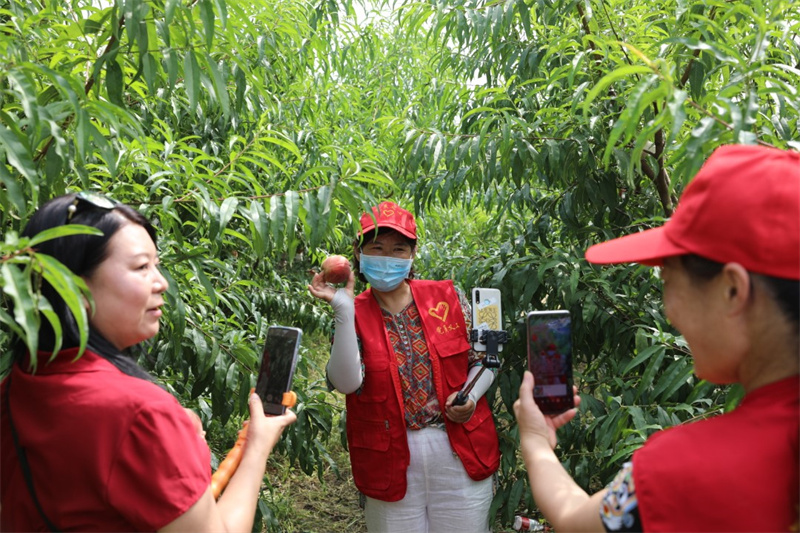 在采摘園里,鄉(xiāng)村主播們各顯其能,一人拿著一部手機,時而對準樹上紅潤的鮮桃,向直播間的觀眾展示;時而邀請身邊的采摘客上鏡,現(xiàn)場散發(fā)著豐收的喜悅。