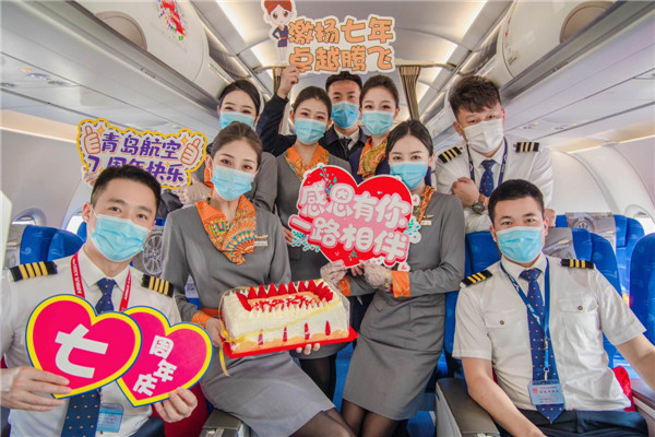 2021年4月26日,青島航空迎來開航七周年,為將這份喜悅與旅客分享,感謝旅客一直以來的支持,青島航空在QW9851航班上特別舉辦了“激揚七年 卓越騰飛”7周年慶主題航班活動,在溫馨熱烈的氛圍中,重溫青島航空的藍(lán)天初心,展望未來浩瀚征程。