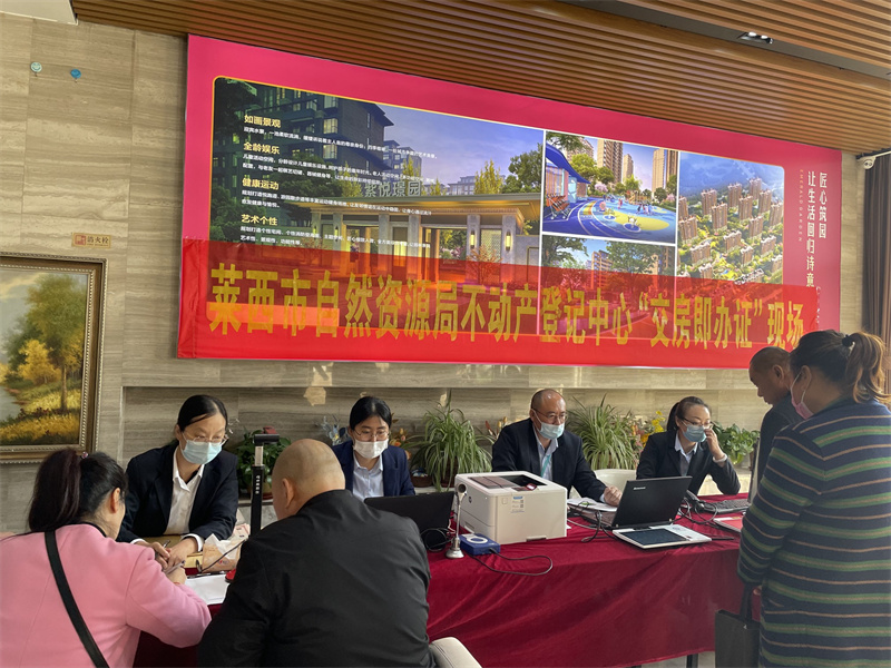 據(jù)悉,“交房即辦證”工作是萊西市學(xué)史力行,深入推進(jìn)“互聯(lián)網(wǎng)+不動(dòng)產(chǎn)登記”的一項(xiàng)重要舉措。為更好的服務(wù)企業(yè)和群眾,讓百姓買(mǎi)房省心、辦證舒心,萊西市創(chuàng)新“聯(lián)合驗(yàn)收”,統(tǒng)籌多個(gè)部門(mén)共同參與,由原來(lái)的坐等服務(wù)到現(xiàn)在的上門(mén)服務(wù),由原來(lái)“折返跑”多部門(mén)到現(xiàn)在的多部門(mén)集中辦公服務(wù),不僅壓縮了工作流程,而且減少了工作時(shí)限。在紫悅璟園小區(qū)交房現(xiàn)場(chǎng),工作人員通過(guò)“一人一機(jī)一窗”新模式受理業(yè)主不動(dòng)產(chǎn)登記申請(qǐng),經(jīng)不動(dòng)產(chǎn)登記和稅務(wù)部門(mén)后臺(tái)人員審核后,申請(qǐng)人在交房現(xiàn)場(chǎng)繳納稅費(fèi)后直接領(lǐng)到不動(dòng)產(chǎn)權(quán)證書(shū)。兩天時(shí)間,共計(jì)76戶業(yè)主在現(xiàn)場(chǎng)辦理不動(dòng)產(chǎn)登記手續(xù)并領(lǐng)取了證書(shū)。