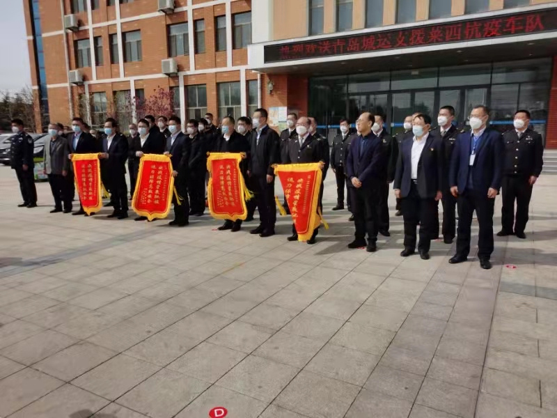 3月29日下午,青島萊西市委市政府在萊西市濟南路小學(xué)樓前舉行歡送青島城運支援萊西抗疫車隊儀式,萊西市委書記周科參加儀式并講話,萊西市領(lǐng)導(dǎo)周科、周才、吳法先、桂曉峰分別向城運控股集團、文旅集團、交運集團、交運萊西事業(yè)部贈送了錦旗。