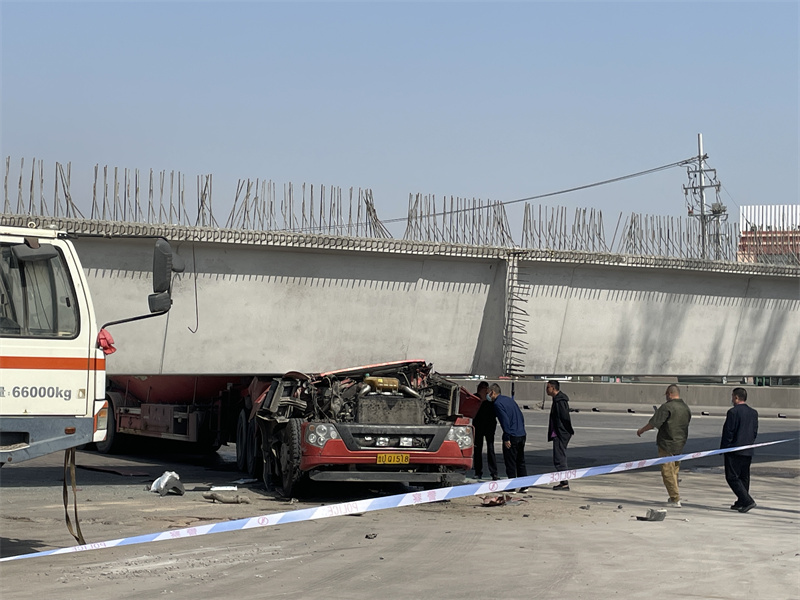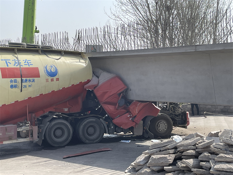 據(jù)了解,事發(fā)時(shí)拉路橋箱梁的路橋車正在從綜合場(chǎng)站由南向東駛?cè)胝?yáng)路,一輛由西向東行駛的罐車直接撞在橫在馬路中間的路橋箱梁。“事發(fā)時(shí)大約5點(diǎn)多,當(dāng)時(shí)霧挺大的。”綜合場(chǎng)站工作人員介紹道,可能當(dāng)時(shí)霧太大,箱梁又是通體水泥色,罐車駕駛員沒(méi)看到路橋車,直接撞了上去。事故發(fā)生后,交警、消防、120紛紛趕到現(xiàn)場(chǎng),經(jīng)確認(rèn),罐車駕駛員當(dāng)場(chǎng)身亡。
