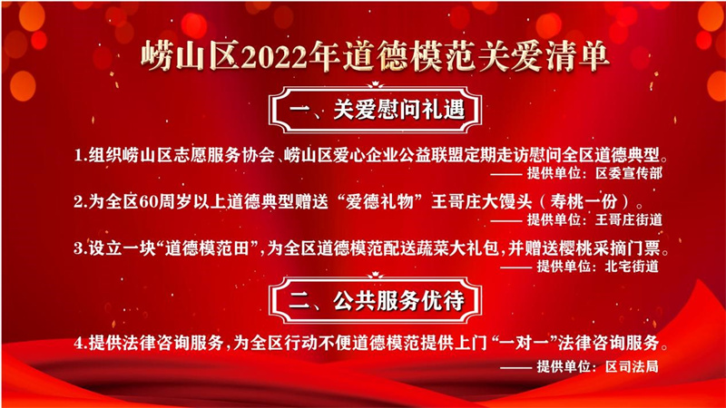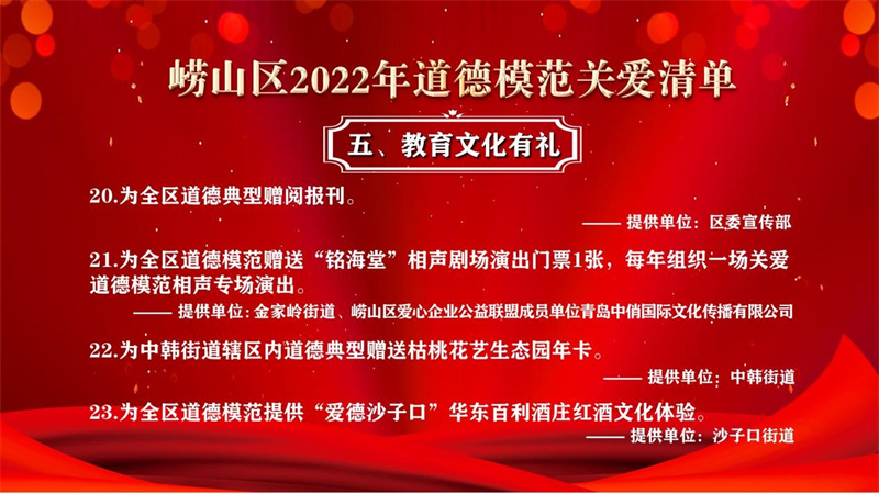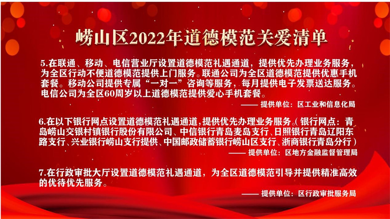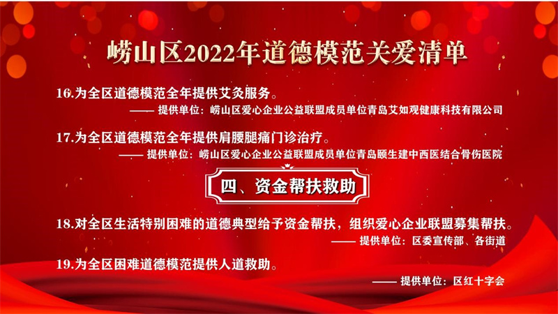 今年,嶗山區(qū)匯聚來自全區(qū)各街道、各部門、各單位、眾多愛心企業(yè)關愛聯盟成員企業(yè)的善行義舉,最終確定走訪慰問、公共服務、醫(yī)療服務、資金幫扶、教育文化和游覽景點等六大板塊、總計36項道德模范關愛舉措。2022年5月1日起,嶗山區(qū)將集中開展“道德模范關愛月”活動,道德模范可憑“嶗·好人卡”享受各項關愛服務,在全社會進一步形成尊重、關愛、禮遇道德模范的濃厚氛圍,樹立崇德尚禮、見賢思齊的價值導向。