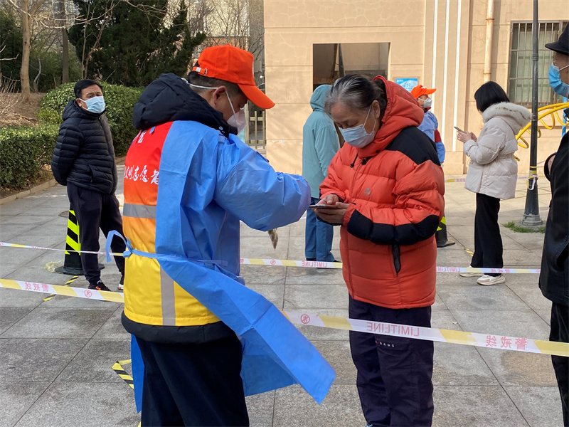 在小區(qū)廣場(chǎng)上,這些志愿者負(fù)責(zé)維持秩序、查驗(yàn)健康碼、測(cè)量體溫。小區(qū)居民在志愿者的引導(dǎo)下,間隔1米排隊(duì)等候,完成檢測(cè)后,志愿者們又給居民發(fā)放“已參加第二輪全員核酸檢測(cè)”標(biāo)識(shí)。