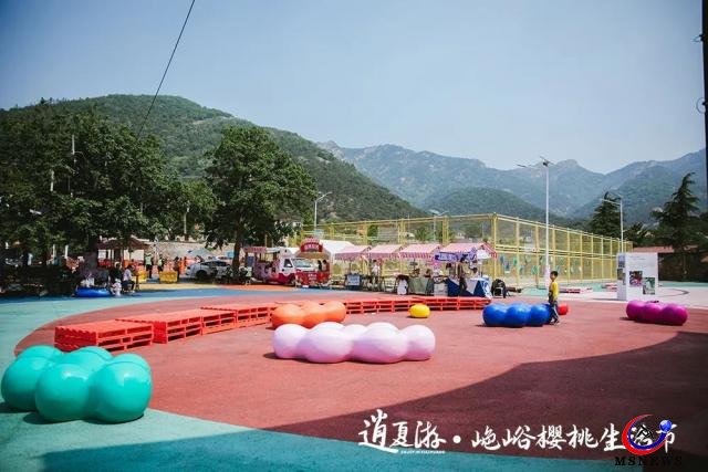 以本次“山色峪櫻桃生活節(jié)”舉辦場地為例——其作為山色峪美麗鄉(xiāng)村藝術(shù)計劃的一部分,通過原有硬件設(shè)施的改造,以及對場地的合理化改造和強視覺設(shè)計,將地面鋪裝用紅色、粉色、藍(lán)色、綠色等高飽和度的配色,以當(dāng)?shù)靥禺a(chǎn)櫻桃為造型元素,通過大色塊組合設(shè)計,實現(xiàn)了功能性與藝術(shù)性的結(jié)合。于此同時,山色峪的重要公共空間、重要的節(jié)點,如山色峪入口、山墻、12座橋梁、文化廣場等,也進(jìn)行了系統(tǒng)的色彩規(guī)劃和設(shè)計改造。借此,夏莊街道計劃通過建筑、公共設(shè)施的藝術(shù)性改造,為區(qū)域的發(fā)展承載更多的可能性,吸引更多游客感受在地性藝術(shù)體驗,激活鄉(xiāng)村振興文旅多樣性。