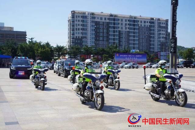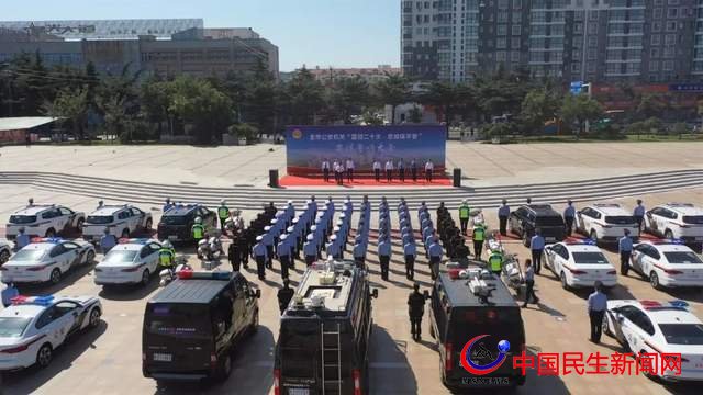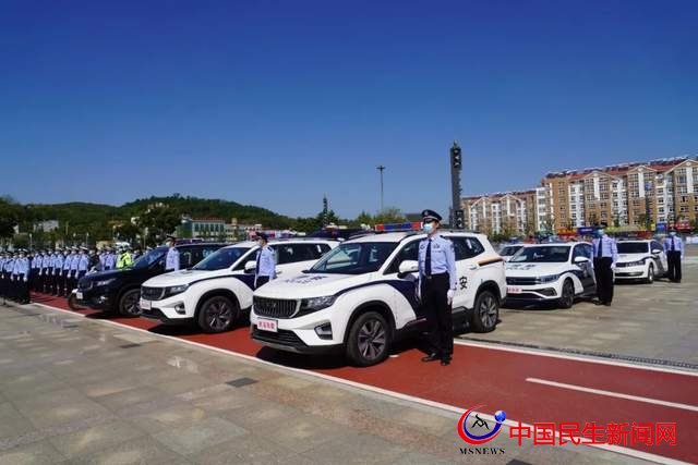 活動現(xiàn)場,由100余名公安干警組成的方隊警容嚴(yán)整、斗志昂揚;新配發(fā)的22輛警車及運兵車、巡邏車、摩托車集結(jié)待命,警燈閃爍、氣勢磅礴?;顒釉卩诹恋膰杪曋虚_幕,包華頒授新配發(fā)的警車鑰匙并致辭。