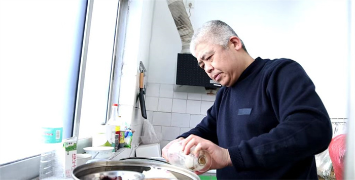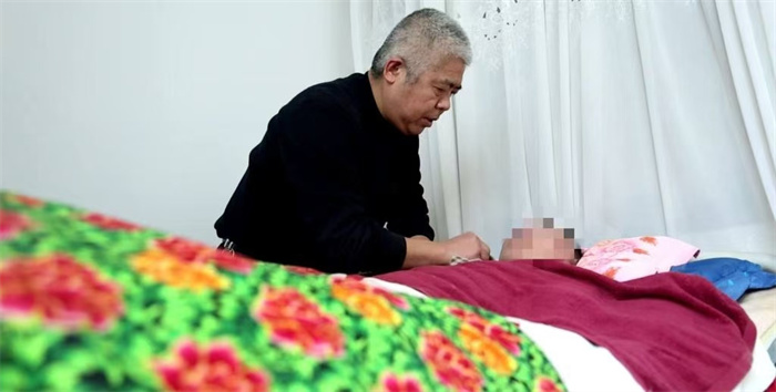 早晨陽光透過窗戶,灑在病床前。飯菜備好,王海亮走進(jìn)妻子房間,一邊將床頭稍微搖起來一點(diǎn),一邊用溫和的語氣說“起來吃飯嘍”,記者注意到,王海亮在喂飯之前特意試了試溫度。雖然妻子沒有明確的回應(yīng),但是從其臉部肌肉的細(xì)微變化看,她似乎是聽懂了。因?yàn)槠拮訜o法咀嚼,只能吞咽,王海亮只能用去掉針頭的注射器,小心翼翼地將流食一點(diǎn)點(diǎn)注入她口中,仔細(xì)把控著每次的喂食量。半碗流食很快喂完,緊接著,他又給妻子喂了半碗促進(jìn)消化的自制飲料。記者注意到,在給妻子喂飯的過程中,王海亮總是表現(xiàn)得很快樂、輕松,還時(shí)不時(shí)和妻子嘮嘮親朋好友的近況,講講工作中的趣事。喂飯結(jié)束,他接著為妻子刷牙、擦臉,幫她活動(dòng)身體。待把妻子妥善安置好,王海亮才匆匆扒拉幾口飯,趕忙奔赴工作崗位。當(dāng)天上午忙碌的工作一結(jié)束,下班后他又馬不停蹄地趕回家,熱好提前備好的飯菜,為了促進(jìn)妻子的腸蠕動(dòng)、預(yù)防疾病,他還會(huì)給妻子的腹部進(jìn)行按摩,適時(shí)加入一些藥物。給妻子喂完午餐、刷牙后,他再次返回工作崗位,中午幾乎沒有休息的時(shí)間。下午下班后,王海亮再次匆忙趕回家中,做飯、喂飯、刷牙、幫妻子活動(dòng)身體,一樣不落。碰上加班,他只能先處理完家中事務(wù),再趕回崗位。每天半夜,他都要多次起身,為妻子翻身拍背、換洗尿墊。