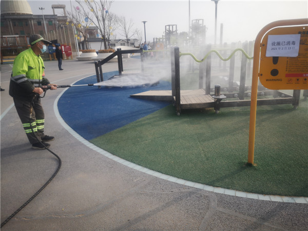 在小麥島橋北側(cè)設(shè)置體溫檢測點(diǎn),對上島游客嚴(yán)格實(shí)施體溫監(jiān)測并出示健康安全碼措施。在濱海步行道及城市客廳主要節(jié)點(diǎn)設(shè)置體溫監(jiān)測崗及臨時隔離區(qū)域。全區(qū)域安排專人收集廢棄口罩,集中處理,防止病毒傳播。安排專職人員每日早晚兩次對區(qū)域內(nèi)市政設(shè)施(游樂設(shè)施、燈桿、休閑座椅、圍擋、果皮箱、公廁內(nèi)部設(shè)施等)進(jìn)行消殺工作,對疫情防控不放松。安排應(yīng)急突擊隊伍。每日安排值班人員1名,應(yīng)急隊伍1隊(15人)24小時在崗待命。