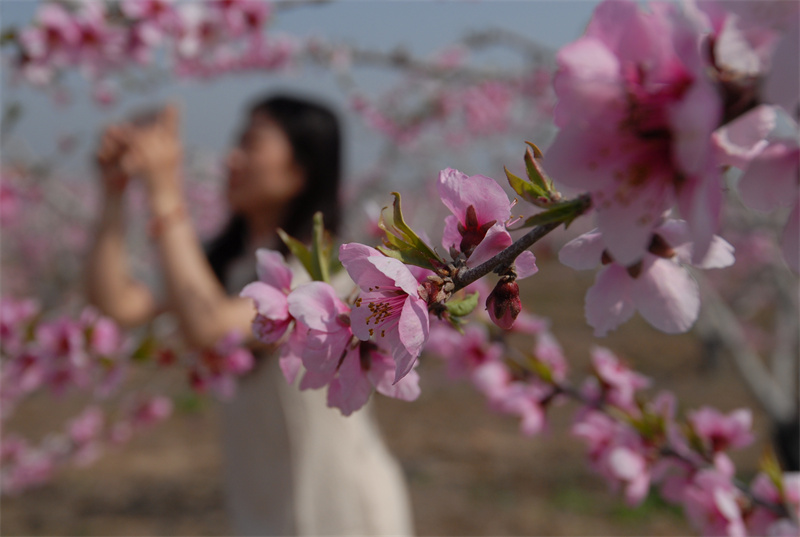 4月11日,記者在山東省青島市即墨區(qū)龍泉街道金秋合作社桃園看到,成群游人穿梭桃花林其間,他們或湊鼻聞花香,或挨枝拍合影。遠(yuǎn)望去,桃花宛如一團(tuán)團(tuán)粉彩云霞落山間,繪就出“山青花欲燃”的詩意美景。走進(jìn)桃林,朵朵粉里透紅的桃花在樹梢上相互簇?fù)?、層層疊疊,在藍(lán)天白云下隨風(fēng)搖曳、毫不吝嗇地綻放姿容,盡情舒展。踏春游人散布在樹下花間,賞花、聞香、拍照,用鏡頭“留住”美好春天,盡情感受春的浪漫。應(yīng)眼前美景,幾位游客情不自禁在花海里唱起了歌曲。不少游客慕名而來,大家紛紛與桃花親密接觸,與桃花留下難忘的瞬間,與朋友共享大自然的美麗。