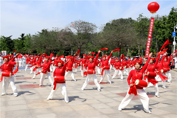 伴隨著悠揚的音樂,1000多名中老年朋友展示的健身氣功《八段錦》、簡化24式太極拳、太極功夫扇,氣勢恢宏、場面震撼,催人奮進(jìn),充分展現(xiàn)出我市太極拳健身推廣的豐碩成果和老年人的康樂風(fēng)采。當(dāng)《沒有共產(chǎn)黨就沒有新中國》旋律響起時,千名參演人員手持一面面五星紅旗,一齊揮動手臂,激情高歌,放聲歌唱偉大的中國共產(chǎn)黨,把現(xiàn)場氣氛推向了高潮。