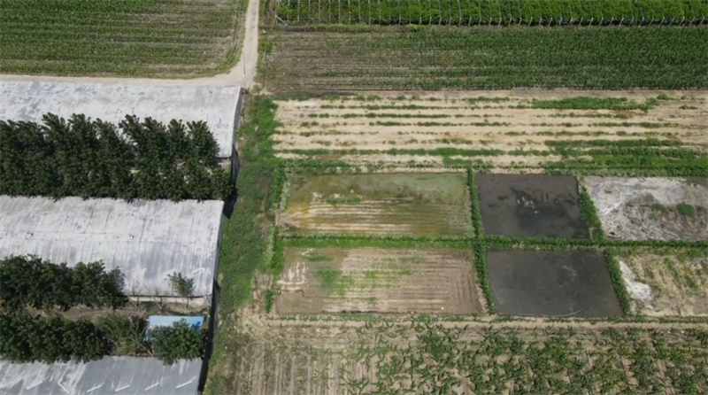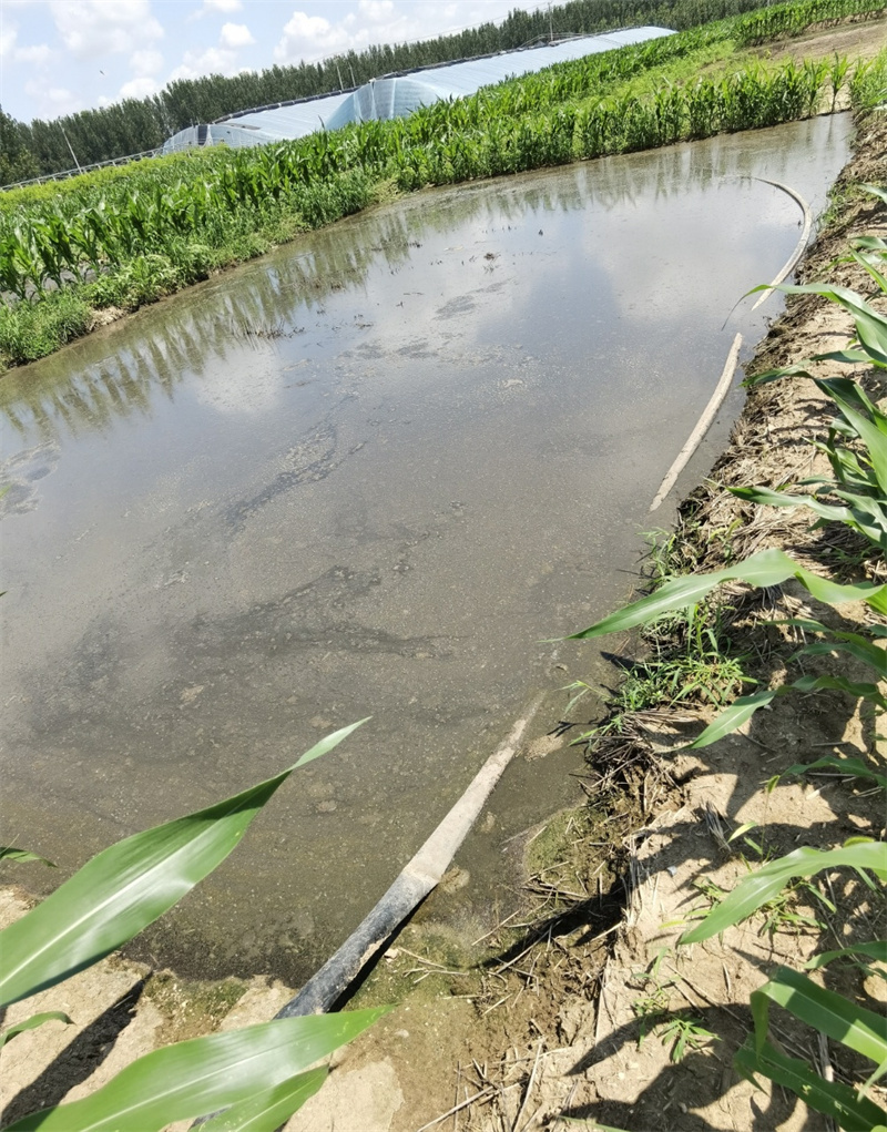 調(diào)查員7日到亓家莊村實地調(diào)查,在村民指引下來到養(yǎng)鴨場,這個養(yǎng)鴨場占地20多畝左右,有六個大型養(yǎng)殖棚。在養(yǎng)鴨場東側(cè)的農(nóng)田里,靠近就聞到陣陣臭味,地壟上長著雜草,地里黑臭寸草不生,沉積著鴨毛等垃圾,踩上去很軟,村民說這是糞水淹過后曬的。沿地壟向東走,看到還沒滲下去的黑臭糞水。再向南還有幾個大坑,滿滿的黑臭糞水,從養(yǎng)鴨場伸出的一根粗塑料管子通向大坑,坑邊種著部分玉米,從遠(yuǎn)處看大坑被玉米擋得很嚴(yán)實,但陣陣臭味還是出賣了它們的存在。排放糞水的農(nóng)田大約在十幾畝地左右,村民說這地就白白浪費了,種上糧食多好。
