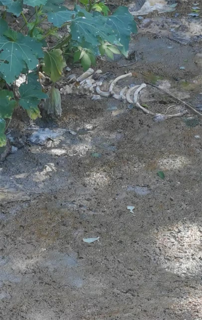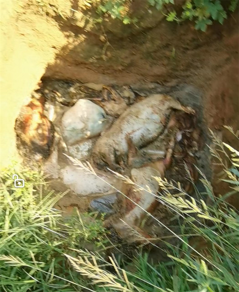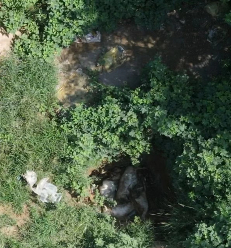 村民領(lǐng)著調(diào)查員沿著糞池東側(cè)小路繼續(xù)向北走,經(jīng)過一個養(yǎng)鴨棚再向西到養(yǎng)豬場東墻下,看到在樹木雜草掩蓋下有一個大坑,里面有七八頭死豬正在腐爛,臭氣熏天令人作嘔。村民說這坑底下有死豬,至少十幾頭。北邊還有一個坑,面積比這個坑還大,整個坑里都是已經(jīng)腐爛成黑臭狀態(tài)的液體,如果不是坑上面還漂浮著部分豬骨的話,很難分清是糞坑還是死豬腐爛到這個成程度的。村民說這就是養(yǎng)豬場處理病死豬的地方,常年如此就地挖坑往里一扔,什么時候坑滿了就蓋點土。村民說如果這些死豬是染病死的就應(yīng)該無害化處理,而不是這樣隨意挖坑一扔。距離死豬坑不到100米就是個養(yǎng)鴨棚,如果有疫情,這附近的養(yǎng)殖戶都要跟著倒霉了。
