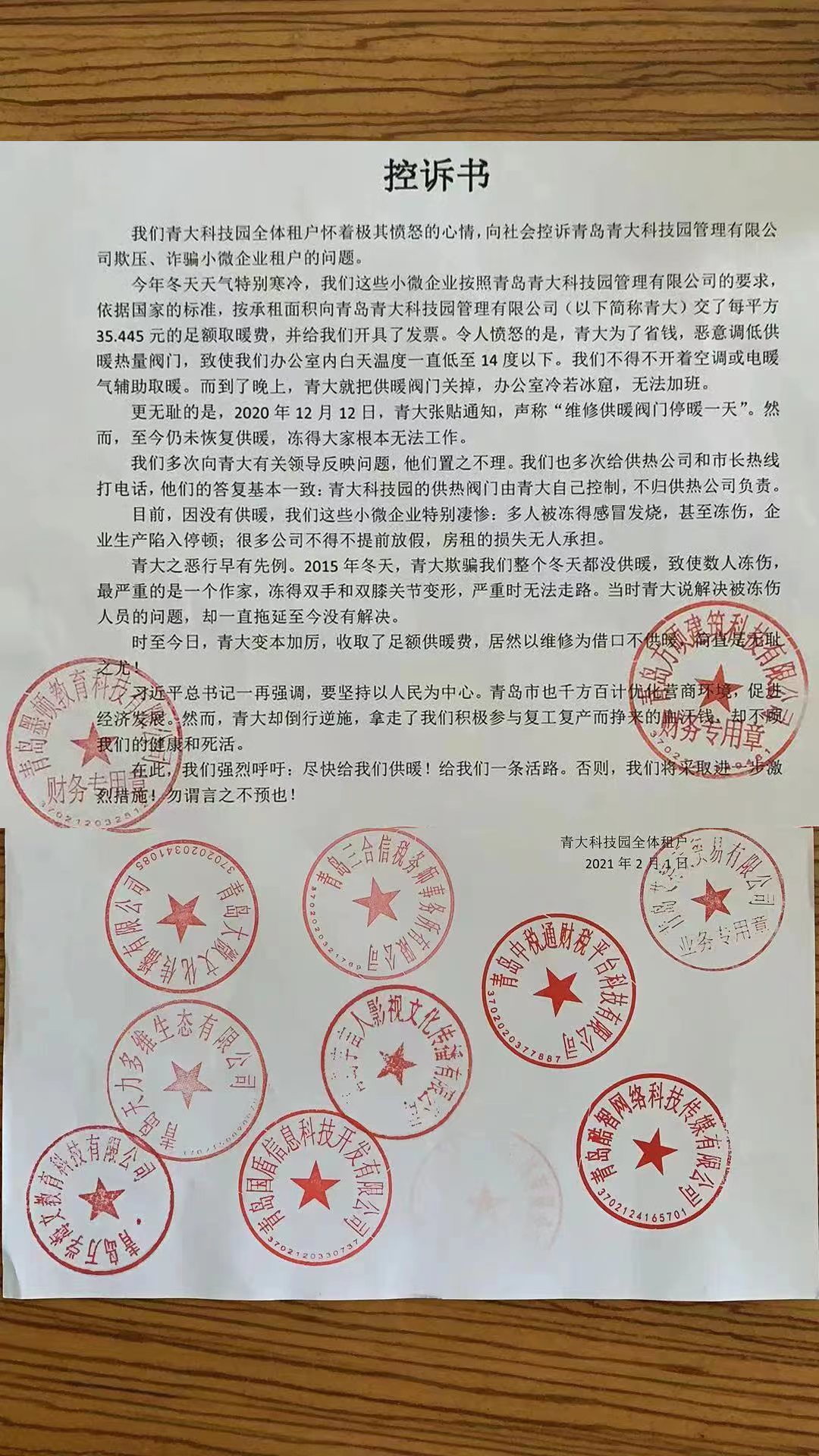 青大不接受凍傷人的教訓(xùn),歷年冬天收費(fèi)不供暖,今冬照舊,使各小微企業(yè)無法過冬,違背中央以人為本的精神。大學(xué)本是教書育人弘揚(yáng)社會(huì)主義精神文明之地,卻長(zhǎng)期干著以大欺小以強(qiáng)欺弱的奸商勾當(dāng),制造社會(huì)不安定因素。呼吁各媒體和全社會(huì)為我司及遭受迫害無法過冬的各小微企業(yè)弱勢(shì)群體伸張正義,討回公道。