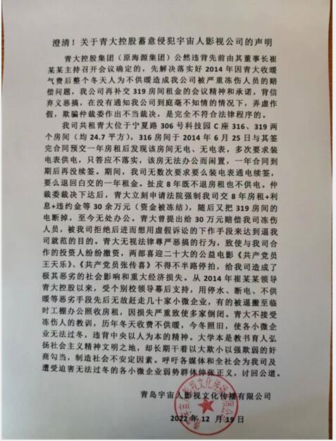 從2014年崔某某領(lǐng)導(dǎo)青大控股以來,受個(gè)別校領(lǐng)導(dǎo)幕后支持,用停水、斷電、不供暖等惡劣手段先后無故趕走幾十家小微企業(yè),有的被逼搬至臨時(shí)工棚辦公照收房租,因損失嚴(yán)重致使多家倒閉。