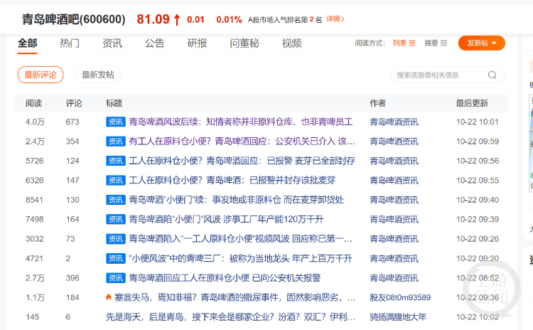 10月22日,“青島啤酒”在東財個股人氣榜中排名第二。網(wǎng)上搜索發(fā)現(xiàn),“史上最貴的一泡尿”“這一泡尿市值上億”等,成為網(wǎng)絡熱詞,有多篇文章分析“小便門”對企業(yè)可能造成的影響。