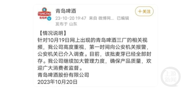 10月20日,青島啤酒發(fā)布情況說明稱,針對10月19日網(wǎng)上出現(xiàn)的青島啤酒三廠的相關視頻,該公司高度重視,第一時間向公安機關報警,公安機關已介入調查。目前,該批麥芽已經(jīng)全部封存。該公司將繼續(xù)加大管理力度,確保產(chǎn)品質量,歡迎廣大消費者監(jiān)督。