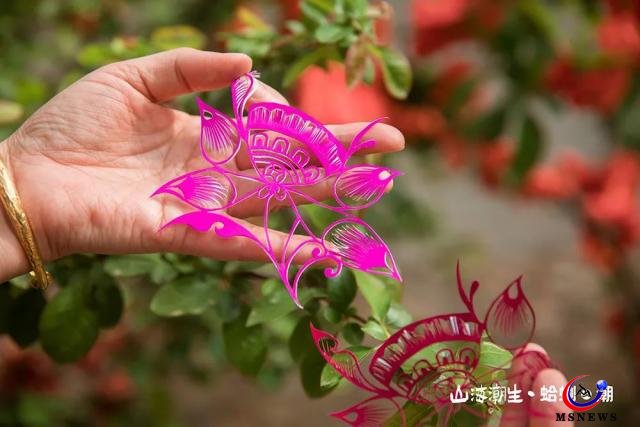 紅島喜盒子制作技藝傳承人郝青青創(chuàng)作的剪紙作品,紅島的地形猶盛開的蓮花,結(jié)合蛤蜊的造型,寓意吉祥喜樂(lè)。