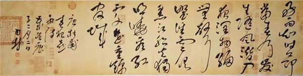 董書林先生的草書,多用圓筆側鋒,內旋外拓,鋒隨勢轉,一如漢蔡邕《篆勢》所論:若鴻鵠群游,絡繹遷延;一筆而下,環(huán)轉紓結,筆斷意連,樸厚茂達,生機無限;大小潤澀攲側反正,不衫不履,特立獨行,妙然天成。并非“懷張”令人難以辨認的狂草,行跡頗多,具有顏體開闊的中宮,不露痕跡地揉進魏碑之野逸曠達,和漢隸“隨心所欲不逾矩”的肆意,王鐸草書的酣泄和釋然,以及林散之草書的疏朗無羈,因而老辣勁拙,八面出鋒,讓人深深感到其間潛藏的風雨雷霆和巨大情感波瀾。瀟灑自得,縱橫捭闔,著墨運筆,流暢如江河奔瀉;激情飛揚,似天馬行空。點畫方圓之間,盡顯董書林先生對書法藝術精到的理解和不凡的才情。