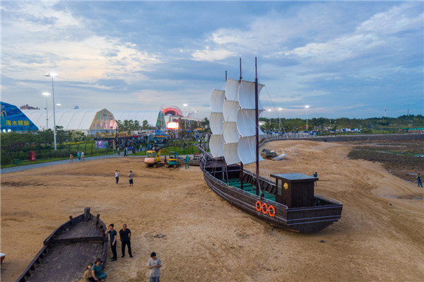 在金沙灘啤酒城南側(cè)沙灘,有一大一小兩艘漁船,在視覺上形成大小對(duì)比,大漁船修復(fù)加帆,并增加了場(chǎng)景化的裝飾,漁船的動(dòng)態(tài)呈現(xiàn)了滿載而歸的寓意,新人們紛紛來此拍婚紗照留念。